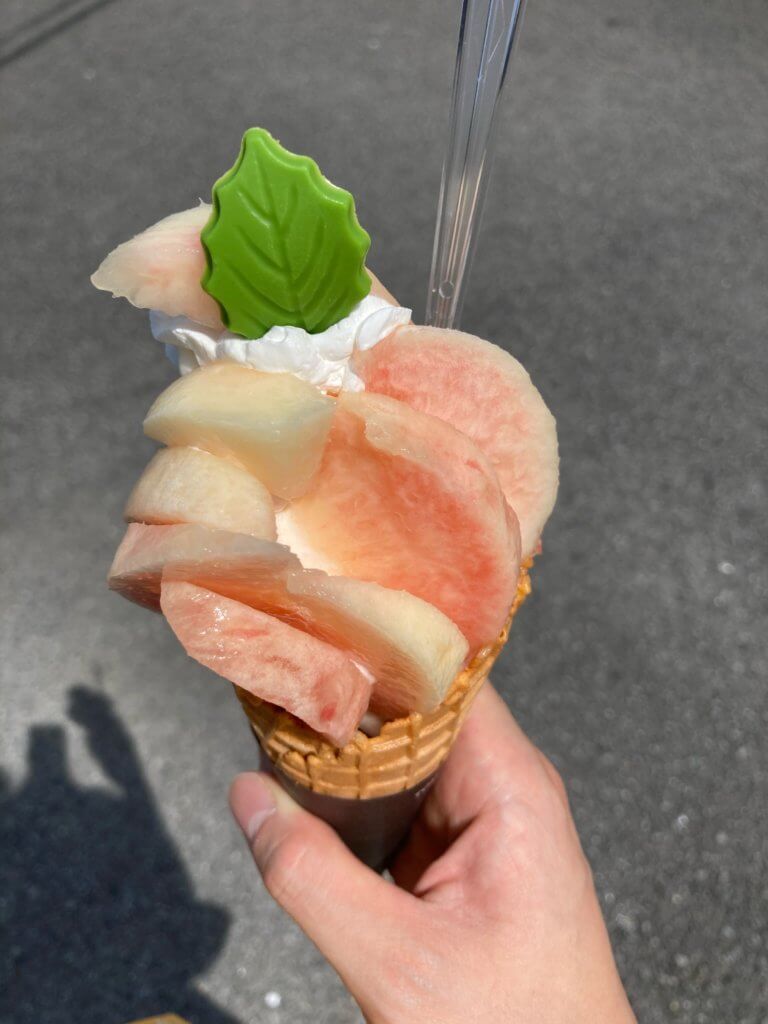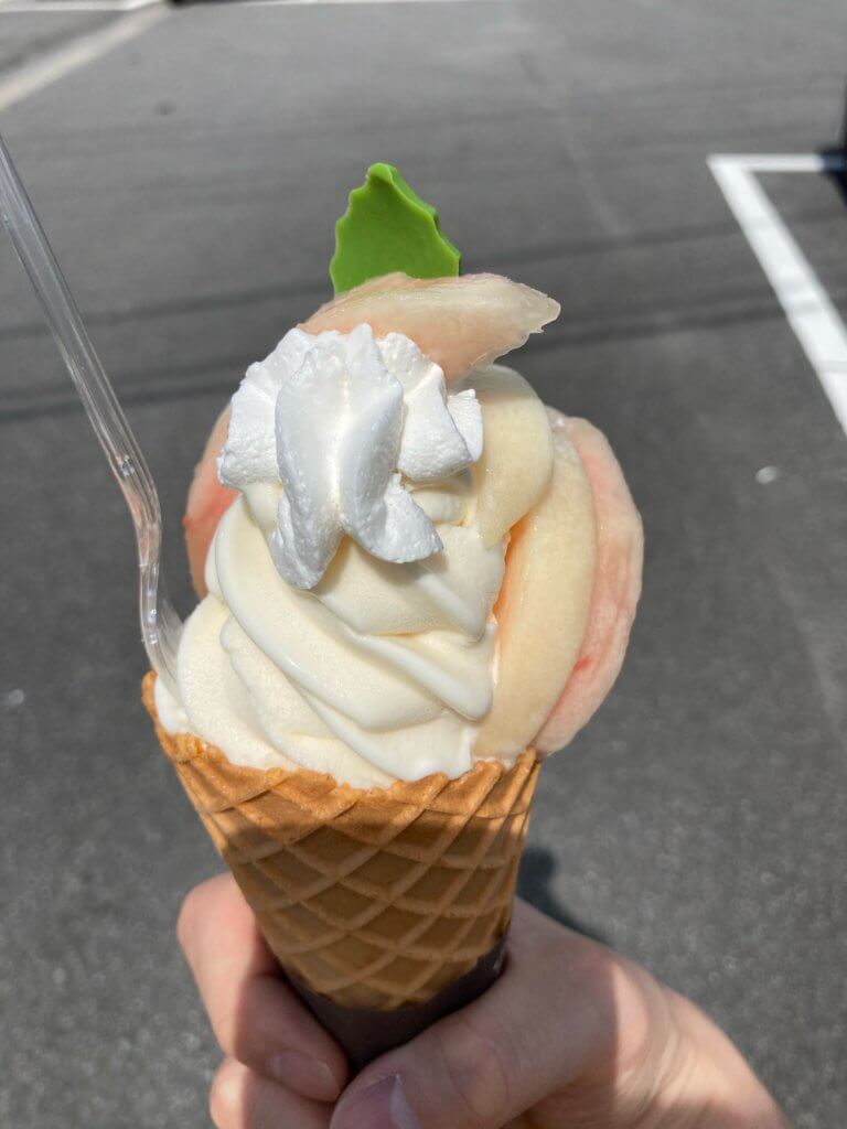 写真では分かりづらいですが、ソフトクリーム自体にもたっぷりと桃が使用されています。果肉をしっかり感じます。