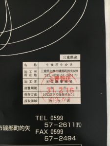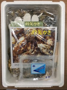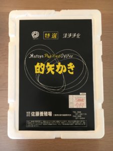このような「的矢かき」のパッケージです。発泡スチロールに入っています。「佐藤養殖場」の表記が本物の証です。